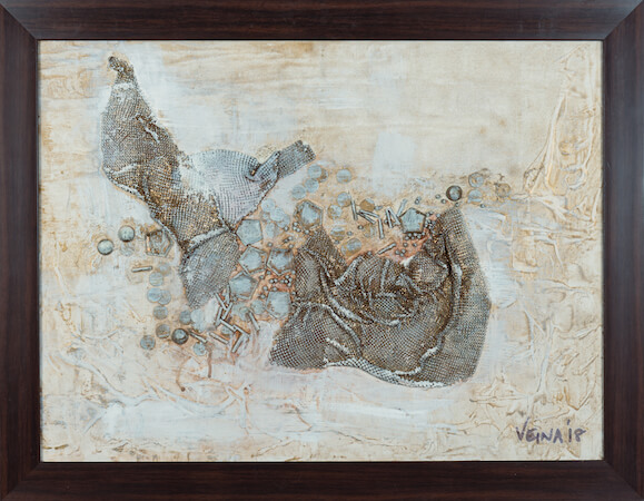 Canvas Board, Metal Mesh and materials. Sequins and beads painted over with acrylic.