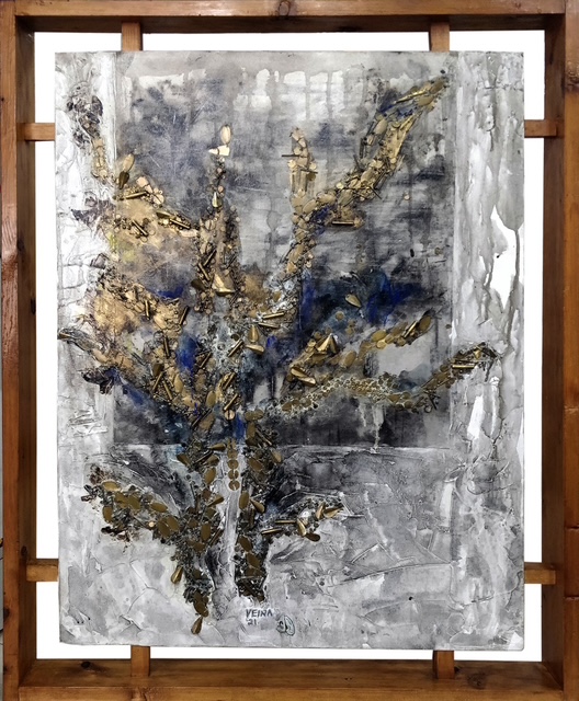 Acrylic paint on canvas with bugle beads and mix raw metallic materials