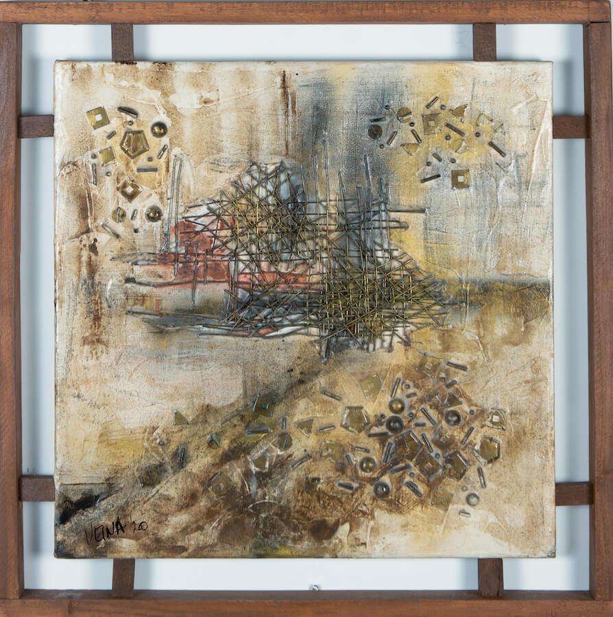 Raw Metallic Bugle Beads and assorted sequins and beads. Acrylic Paints on canvas