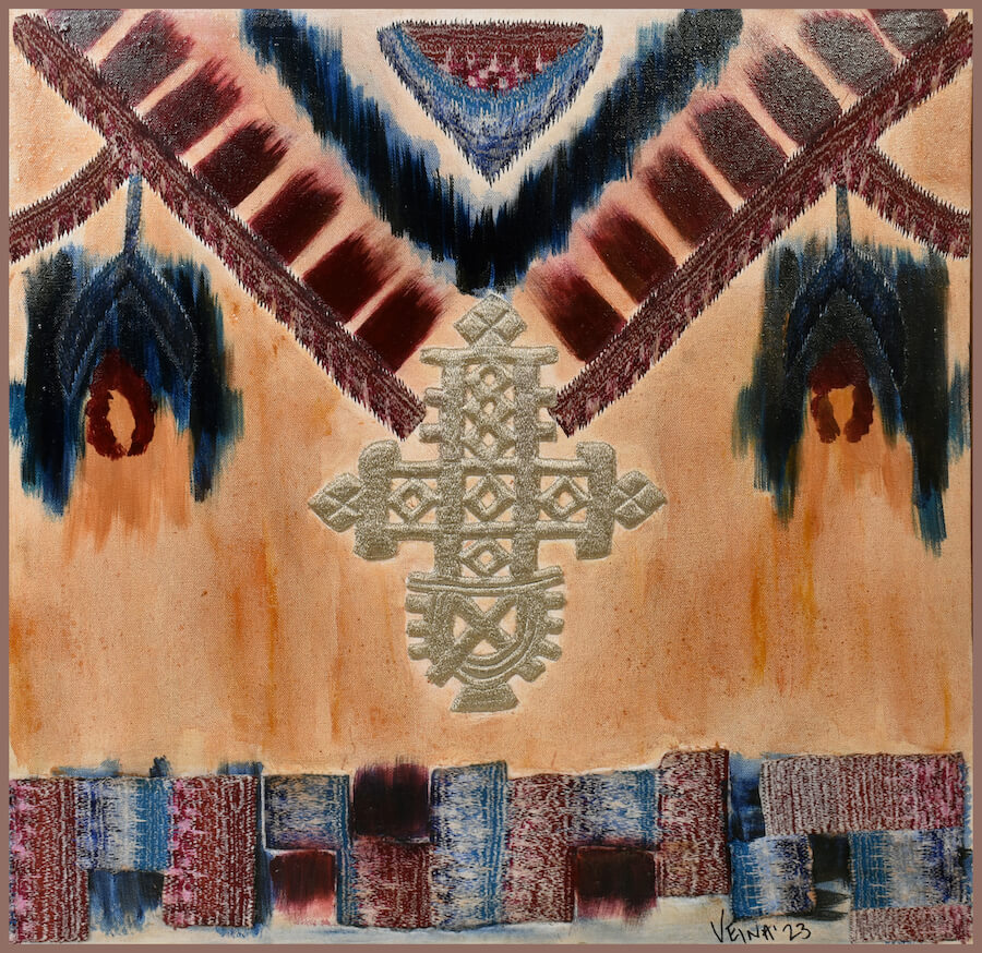 Year: 2023 24″ x 24″ – Framed Mixed Media , Silk Thread Embroidery & Acrylic Paints.