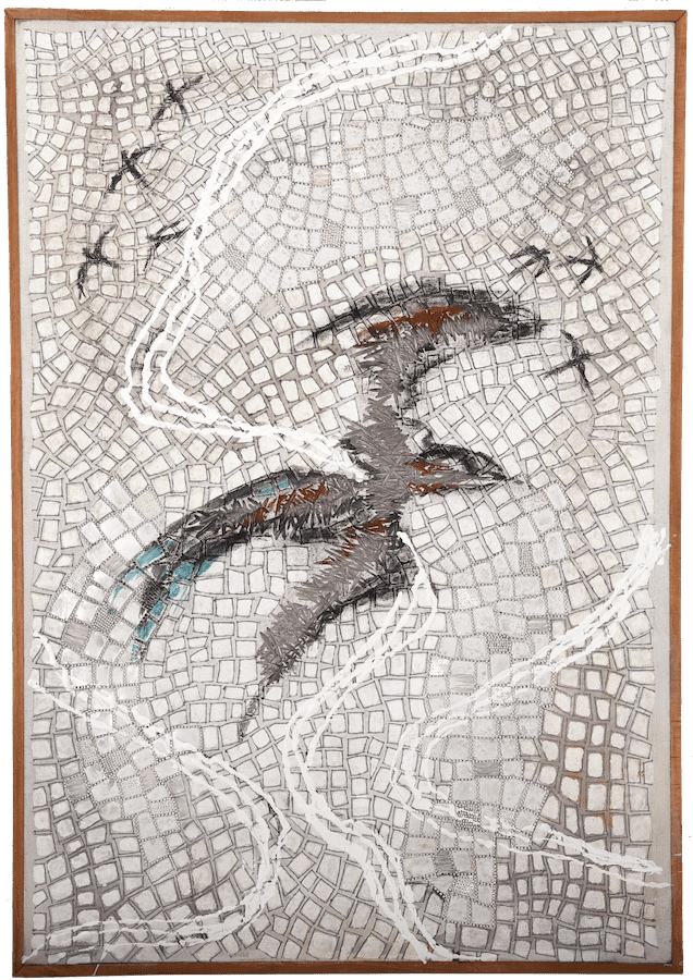 raffia threadwork embroidery, hand cut sequins, gesso and acrylic paints